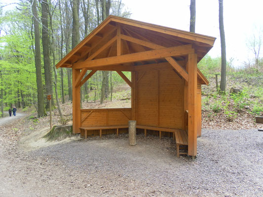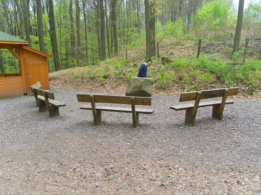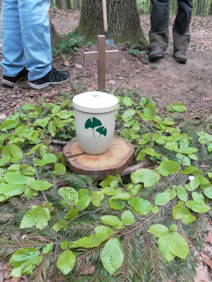 Im Eingangsbereich des Waldes spazierten die Teilnehmer zunächst zu einem kleinen Pavillon, der an Schlechtwettertagen vor Wind und Regen schützt. Ein Andachtsplatz mit einem Findling und Bänken ist ein zentraler Ort des Gedenkens und Erinnerns im FriedWald.