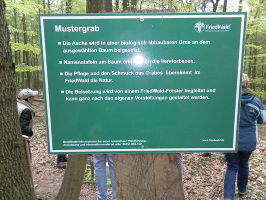 Wie erkenne ich einen FriedWald? Welche Grabarten gibt es? Wie sieht ein Baumgrab im FriedWald aus? Welche Kosten sind mit dieser Grabart verbunden? Was ist der Unterschied zwischen einem Familien- und Freundschaftsbaum? Diese und viele weiteren Fragen beschäftigten die anwesenden Teilnehmer und Herr Schneider wusste auf alle Fragen, teilweise sogar sehr unterhaltsam, zu antworten. Und so verging die fast 2 stündige Waldführung sehr schnell. Ein Dankeschön an dieser Stelle der Friedwald GmbH und Herrn Schneider für die Durchführung dieser privaten Waldbegehung.